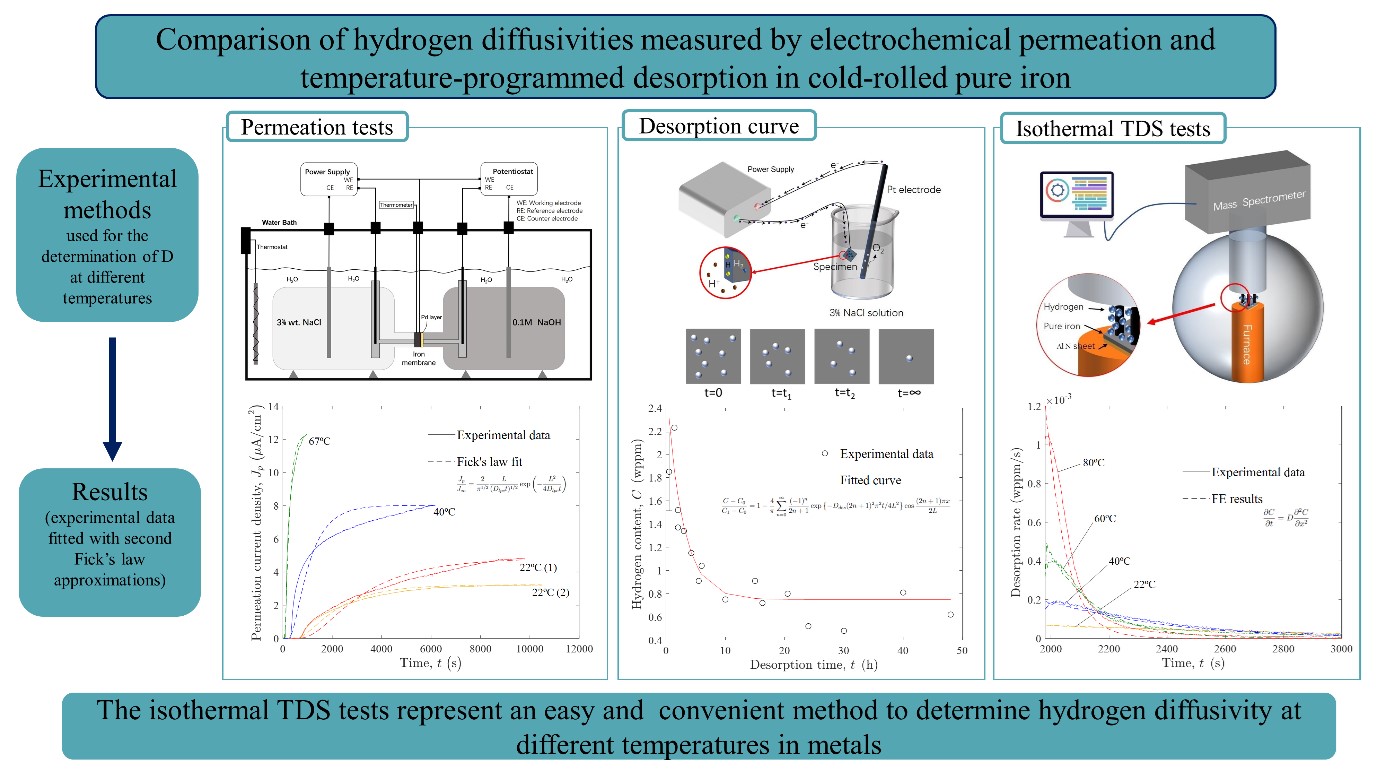 The diffusivity of hydrogen in cold-rolled pure iron is investigated using permeation and desorption methods. Electrochemical charging, electro-permeation and thermal desorption spectroscopy (TDS) experiments are conducted. Firstly, the relation between the charging current and the hydrogen concentration is established. Secondly, permeation experiments are conducted at 22, 40 and 67ºC to quantify the diffusivity dependence on temperature. Thirdly, the diffusivity is estimated by using two types of desorption experiments and Fick's law: (i) a `rest time' method, by which we measure the hydrogen content of samples held at room temperature for different times, and (ii) by conducting isothermal desorption experiments at temperatures ranging from 22 to 80ºC and fitting the resulting desorption rate versus time curves. Good agreement is obtained between the isothermal desorption and permeation approaches, with observed differences discussed and rationalised. Moreover, measured diffusivity values for cold-rolled pure iron are also found to be comparable to those reported in the literature. This work demonstrates that isothermal desorption experiments are a convenient approach to determine hydrogen diffusivity over a wide range of temperatures, as facilitated by new TDS systems with fast heating rates.